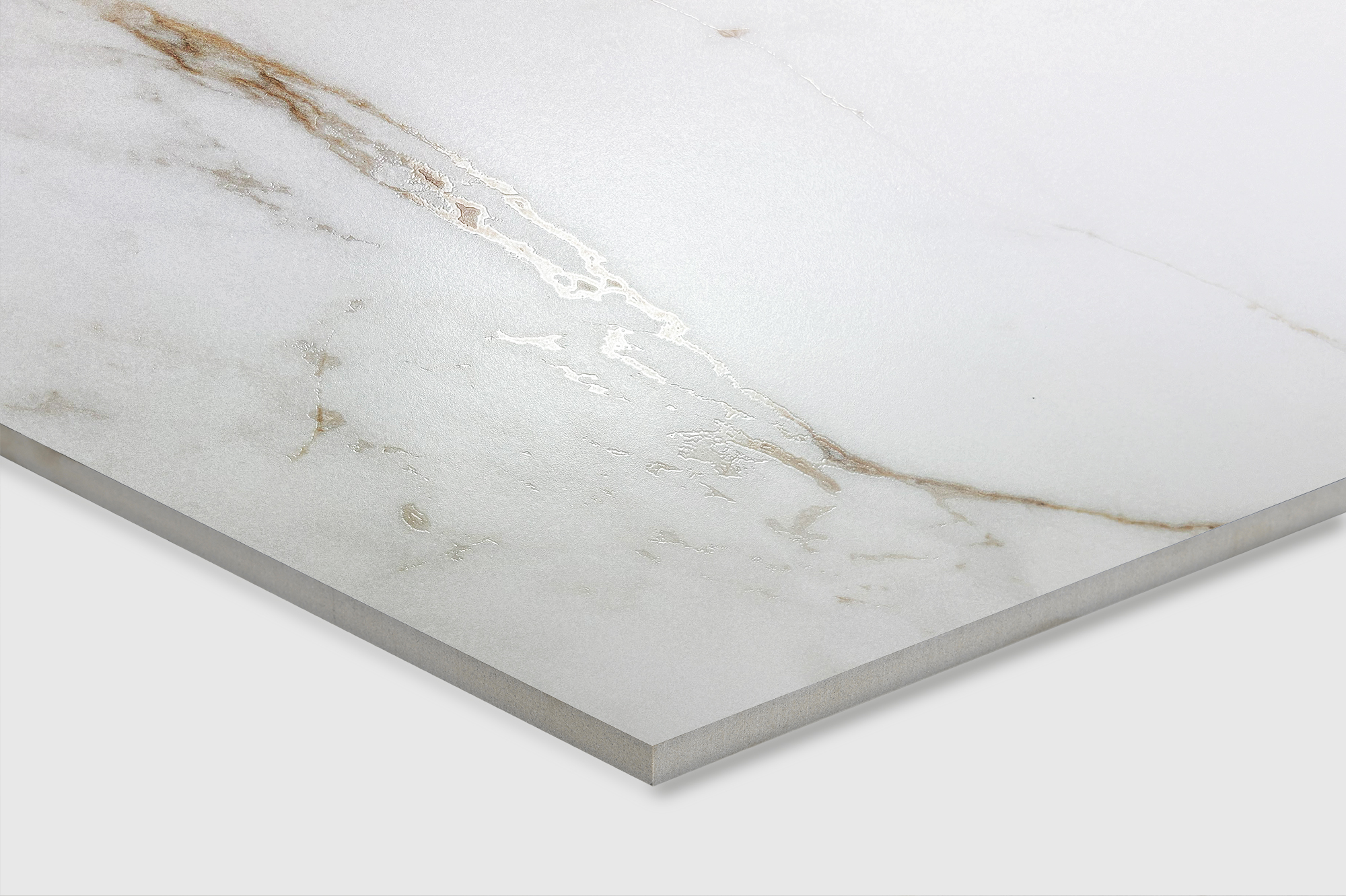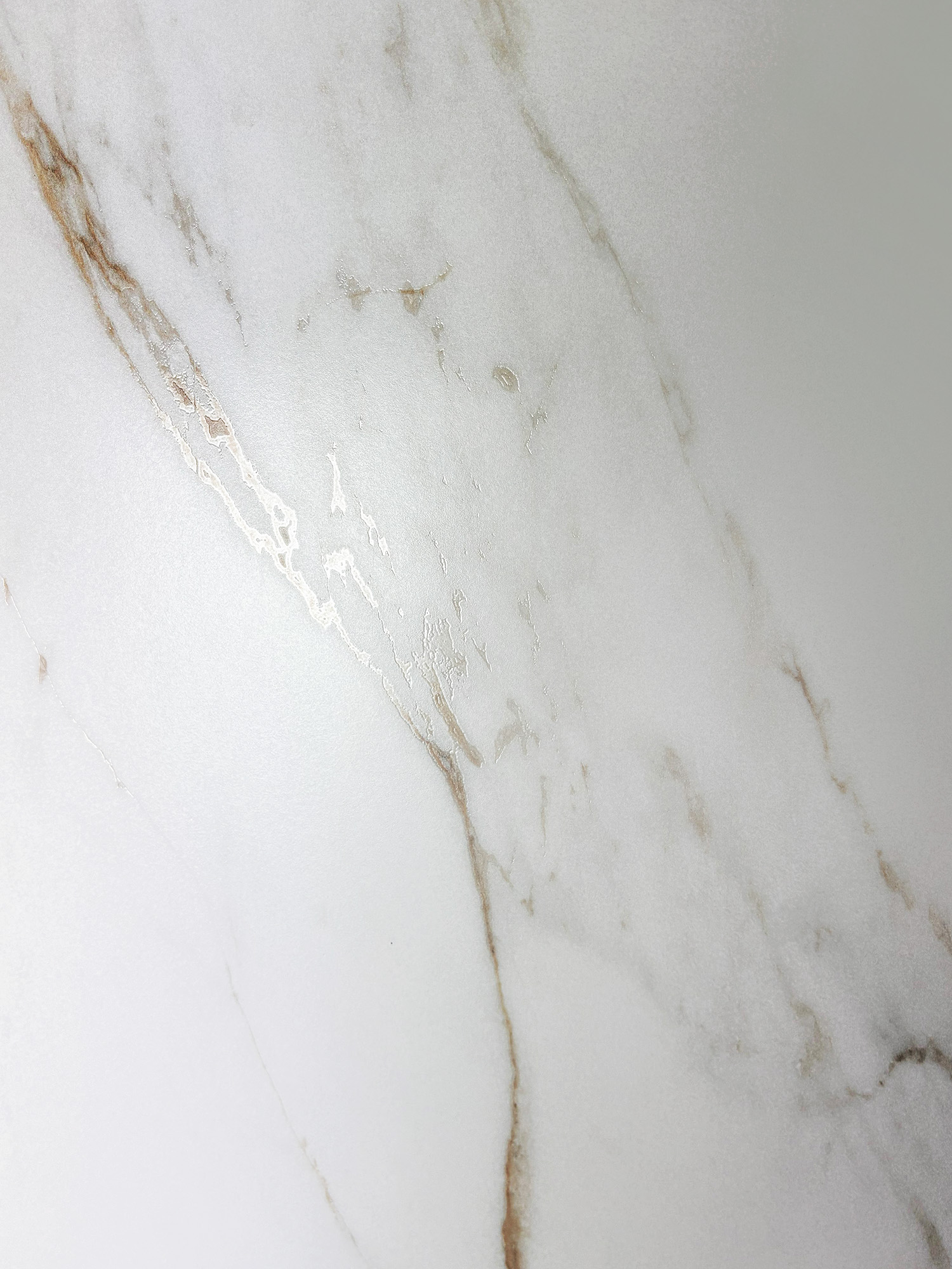 ENFOLD STATUARIO — изысканный керамогранит премиального класса с эффектом мрамора. Матовая белая поверхность с серыми и золотыми переливающимися прожилками выглядит дорого и стильно.